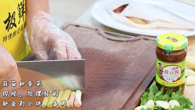 蒜苗和香菜切段、處理好的鱸魚剁成小塊,放碟子里備用