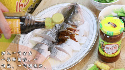 往魚上加入一勺東古金莊一品鮮醬油、一勺鹽、一勺胡椒粉、一勺一品鮮黃豆醬、一勺面粉撈拌均勻,腌制兩分鐘