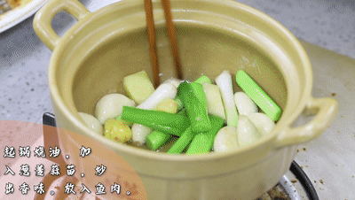 起鍋燒油,加入蔥姜蒜苗,炒出香味。放入魚肉,把剛剛腌制的料汁也加進去,再加半碗水。
