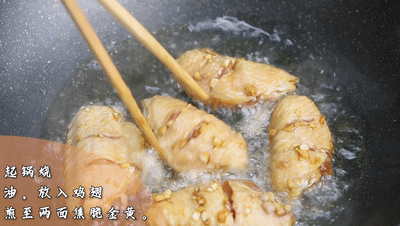 起鍋燒油,放入雞翅醬汁兩面焦脆金黃
