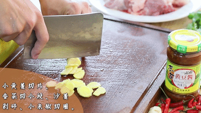 小黃姜切片、香菜切小段、沙姜剁碎、小米椒切圈備用