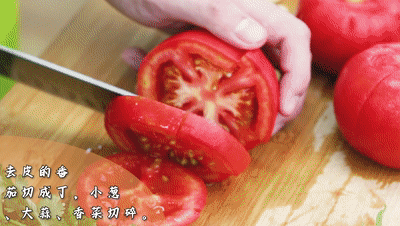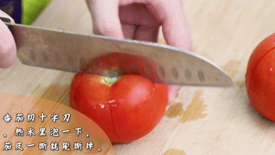 番茄切十字刀,然后放熱水里泡一下,這樣番茄的皮一撕就能撕掉