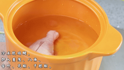 最后就是熬雞湯:鍋里放水,冷水放入兩個(gè)雞腿,加入姜、蔥、八角、香葉、花椒、干辣椒,蓋蓋熬半個(gè)小時(shí),加入一勺東古一品鮮雞精和東古雞粉,在熬煮10分鐘