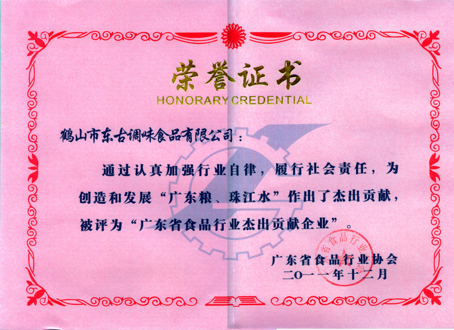 2011廣東省食品行業(yè)杰出貢獻(xiàn)企業(yè)