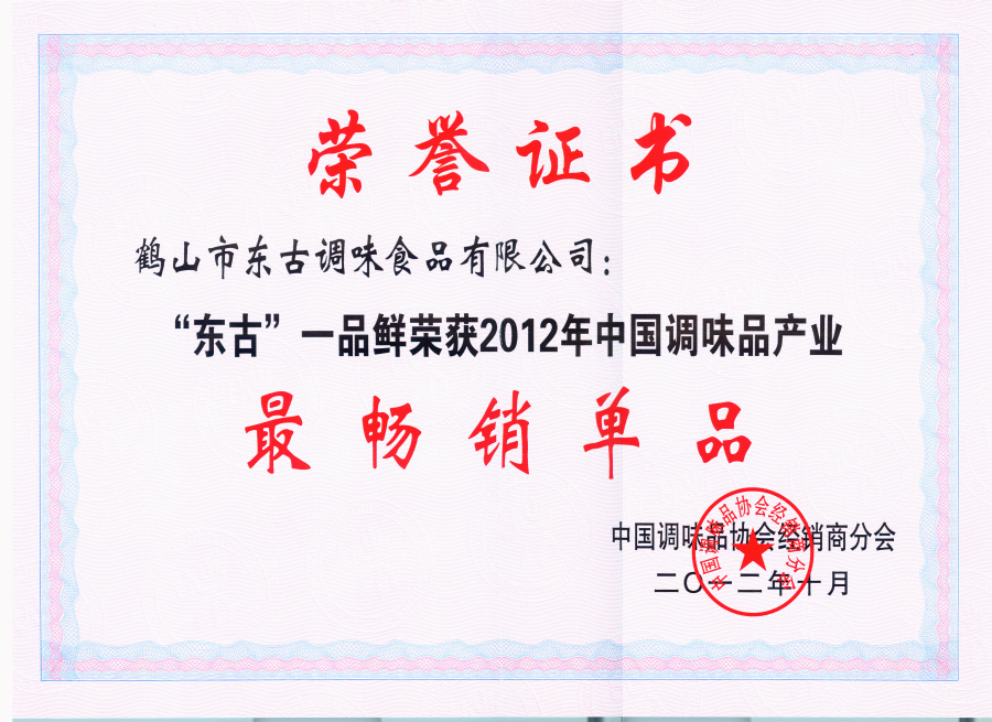 2012東古一品鮮獲2012最暢銷單品獎(jiǎng)項(xiàng)證書(shū)